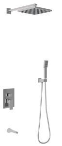 Душевой комплект BERGES - встраиваемый душевой комплект обладает двухрежимной системой и состоит из верхней лейки - «тропического ливня», ручного душа и смесителя. Лейка верхнего душа имеет инновационную систему самоочистки в виде гибких силиконовых вставок на форсунках душа, которые защищают изделие от известковых отложений. Изготовлены оба душа из ABS пластика, имеют хромоникелевое покрытие, которое выглядит безупречно на протяжении всего периода эксплуатации. Шланг выполнен из нержавеющей стали (внутри epdm), смеситель с латунным корпусом имеет керамический картридж с пропускной способностью 28 л/мин, все держатели и кронштейны сделаны из латуни и нержавеющей стали.Скрытый монтаж комплекта позволяет создавать красивое и эргономичное внутреннее пространство всего помещения.