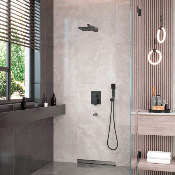 Душевой комплект BERGES VENTAS 3S BLACK - встраиваемый душевой комплект обладает трёхрежимной системой и состоит из верхней лейки - «тропического ливня», ручного душа, излива и смесителя.Лейка верхнего душа имеет инновационную систему самоочистки в виде гибких силиконовых вставок на форсунках душа, которые защищают изделие от известковых отложений. Верхний душ изготовлен из нержавеющей стали. Ручной душ – из ABS пластика. Оба душа имеют черное матовое покрытие, которое выглядит безупречно на протяжении всего периода эксплуатации.Шланг выполнен из нержавеющей стали (внутри epdm), смеситель с латунным корпусом имеет керамический картридж с пропускной способностью 28 л/мин, все держатели и кронштейны сделаны из латуни и нержавеющей стали.Скрытый монтаж комплекта позволяет создавать красивое и эргономичное внутреннее пространство всего помещения.