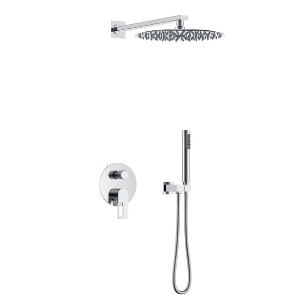 Душевая система скрытого монтажа датского производителя Black&White в цвете глянцевый хром. В комплект готового решения входит:кронштейн с верхним душем, блок смесителя с внешней и внутренней частью, а также подключение ручной лейки с держателем. Элементы продукта за исключением леек изготовлены из сантехнической латуни – ресурсного и безопасного для здоровья сплава, а ручной душ и верхняя лейка – из армированного ABS пластика. Для включения и настройки температуры воды установлен керамический картридж и поворотный дивертор. Данное решение позволит сэкономить свободное пространство внутри душевой зоны и сократит количество поверхностей для уборки, а пересечение в концепции дизайна круглых и квадратных форм наполнит Вашу душевую зону уютом и стилем.