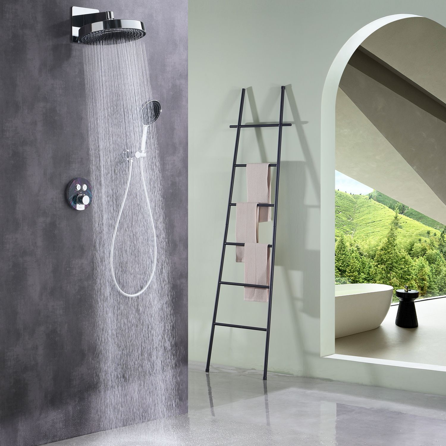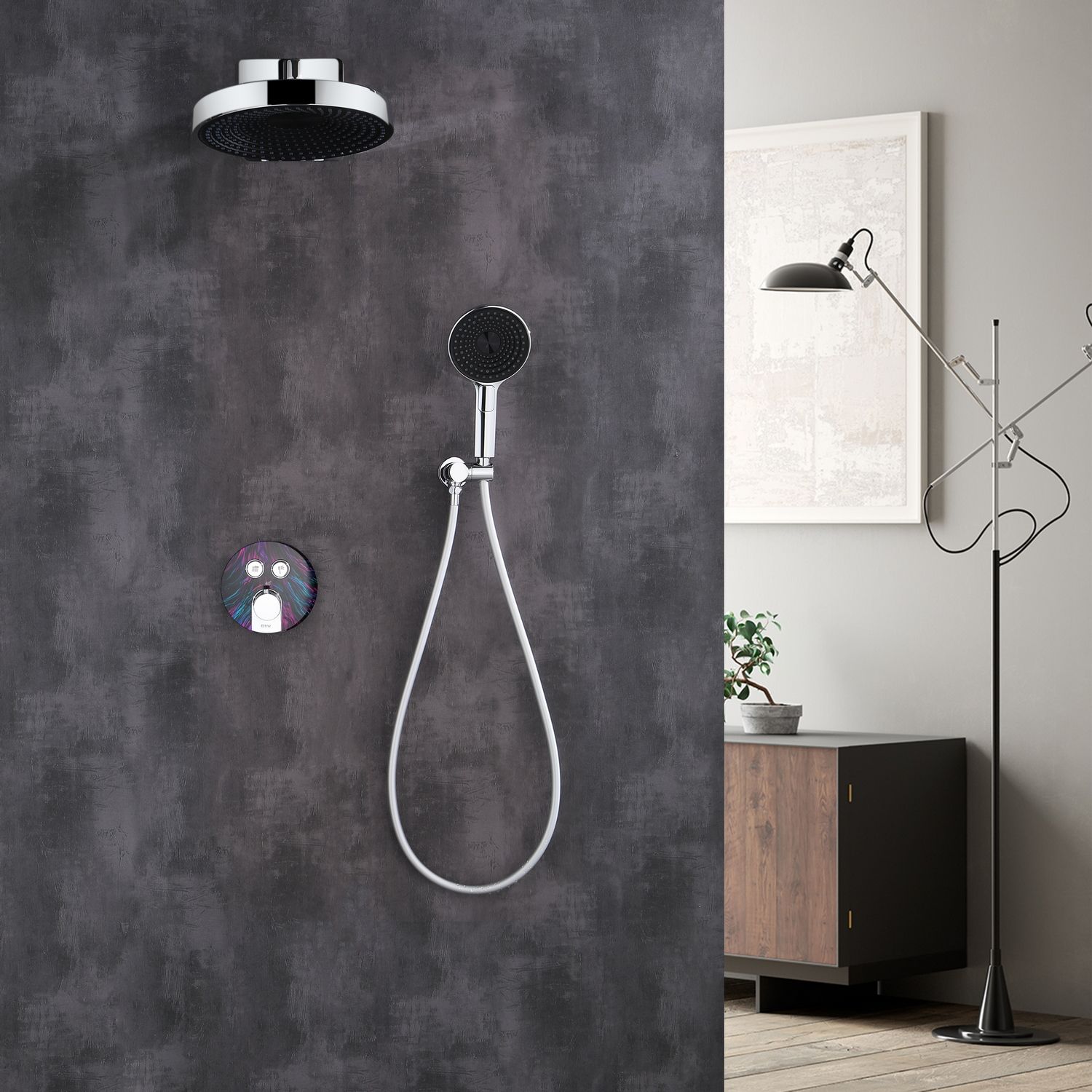 Для управления потоком воды и настройкой температуры установлен термостатический картридж прогрессивного типа с постоянным давлением, а для выбора нужного режима работы интегрированы две клавиши круглой формы. Из потребителей в комплектацию входит ручной душ с режимами, а также верхняя лейка с настенным кронштейном. Важно подчеркнуть, что в данной серии внешняя часть корпуса смесителя задекорирована вставкой под темный мрамор с разноцветными прожилками, которые акцентируют на себе внимание в любой душевой зоне.