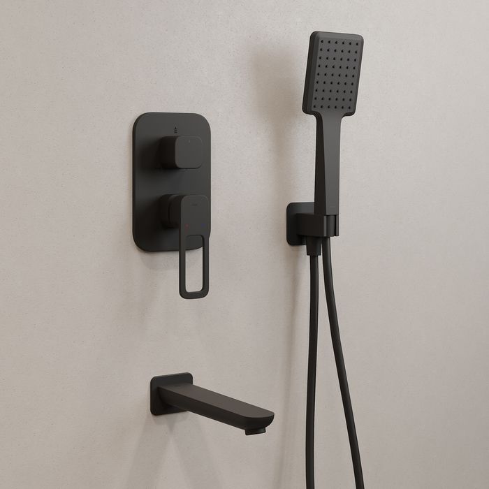 Готовый набор встраиваемой сантехники в стильном черном цвете включает всё необходимое для обустройства комфортной красивой ванной. Так выгоднее и удобнее, чем купить всё отдельно. Оптимальная подборка Slide: смеситель, верхняя лейка с кронштейном для тропического душа, излив, ручная лейка, душевой шланг и выход для шланга с держателем для лейки.
