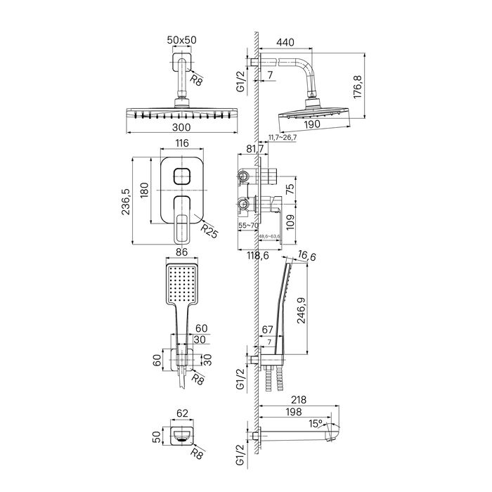 Скрытый монтаж без выступающих элементов экономит пространство и упрощает уборку. Подключение с помощью любых труб, диаметр входных отверстий – ?”.