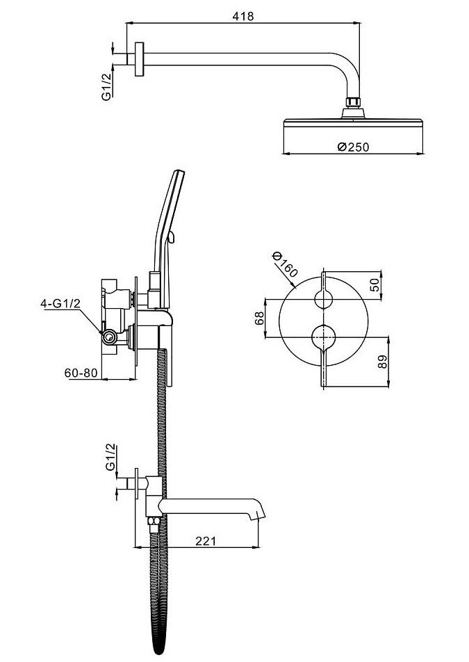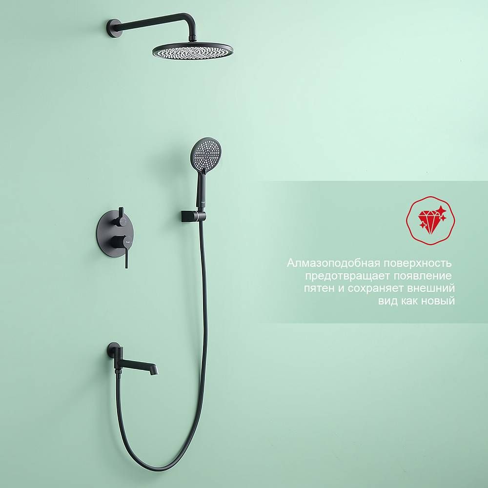 Душевая система встраиваемая Raglo R20.27.06, черныйМатериал: латунь.Управление: однорычажное.Механизм: керамический картридж.Излив: поворотный. Аэратор.Диаметр верхнего душа: 250 мм.Форма верхнего душа и ручного душа: круглая.Количество режимов струи ручного душа: 3.Стандарт подводки: G 1/2.Монтаж: встраиваемый.Излив - функция переключения.