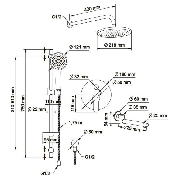 - верхний душ (душевая головка) с регулировкой наклона, настенный монтаж;