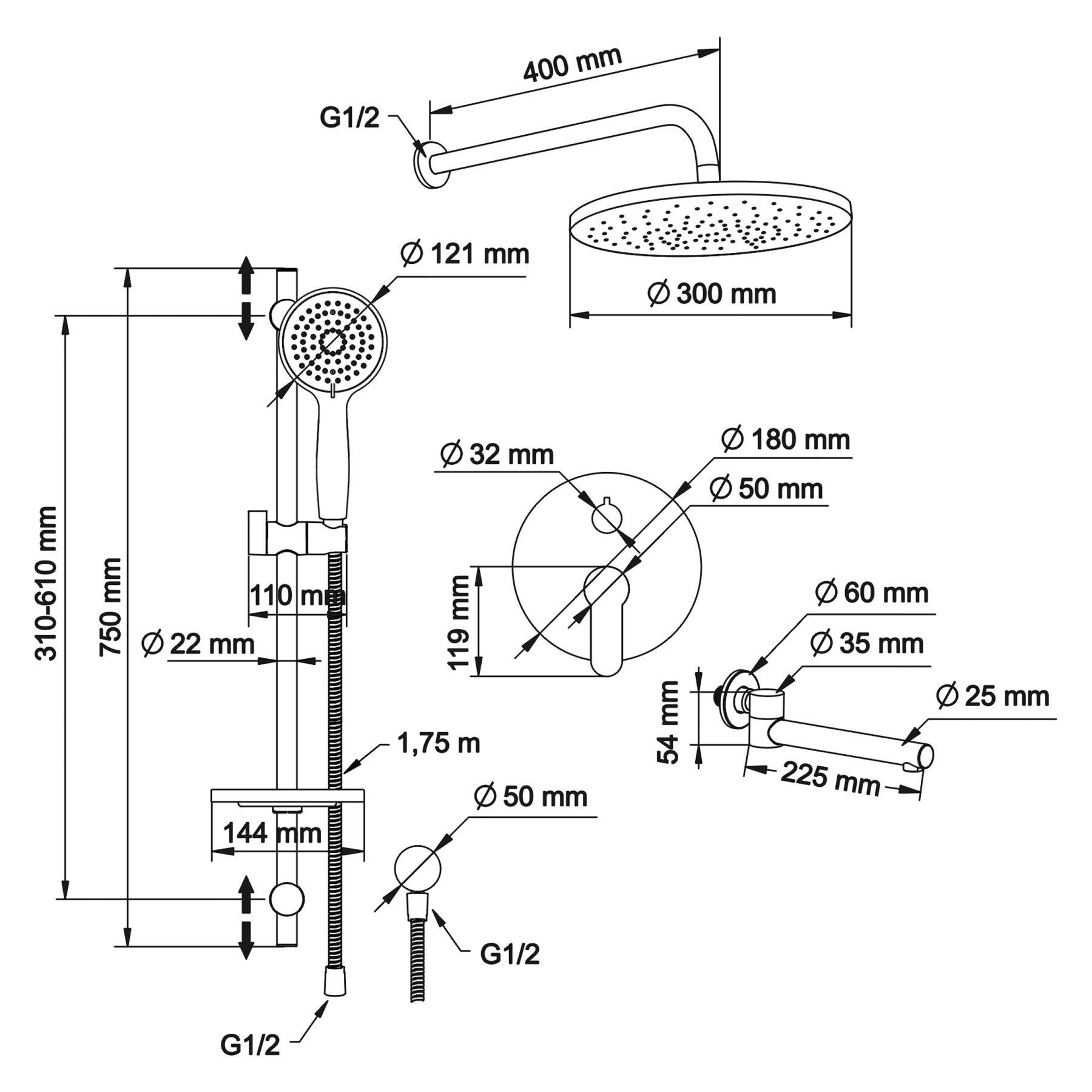 - верхний душ (душевая головка) с регулировкой наклона, настенный монтаж;
