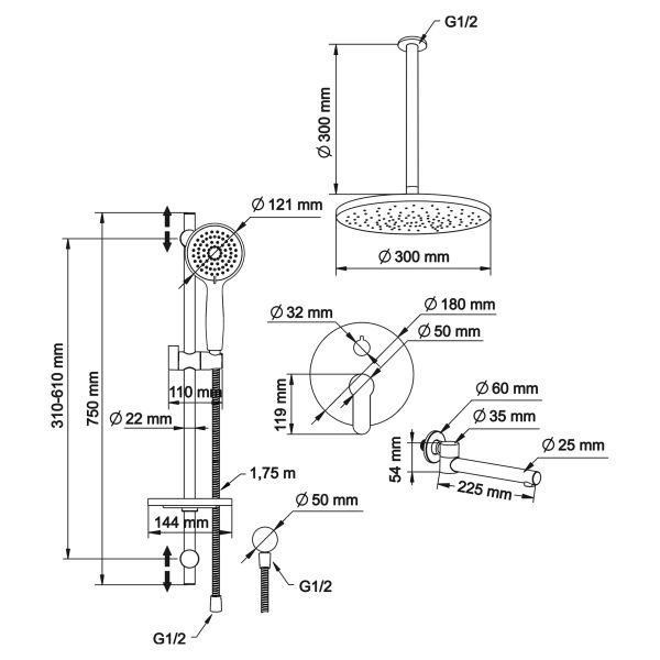 - верхний душ (душевая головка) с регулировкой наклона, потолочный монтаж;