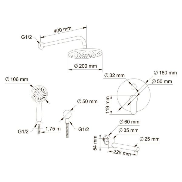- верхний душ (душевая головка) с регулировкой наклона, настенный монтаж;