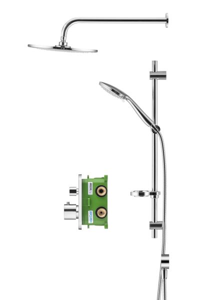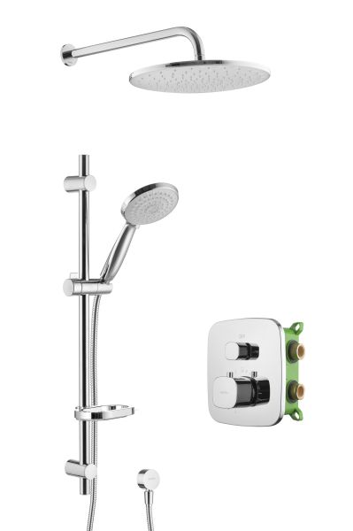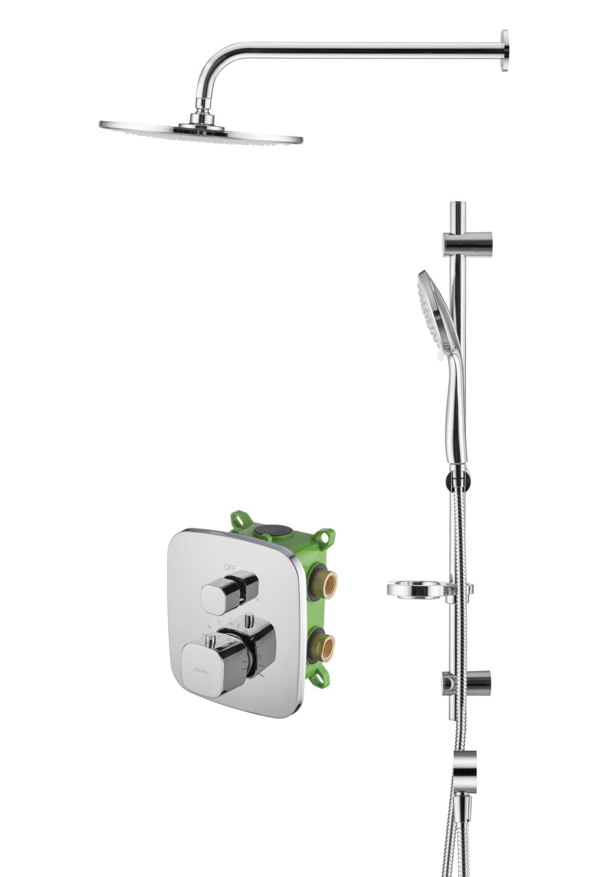 Душевой комплект со встраиваемым термостатическим смесителем на 2 выхода (в монтажном боксе), верхним душем ø300 мм и лейкой ø121 мм (3 режима)