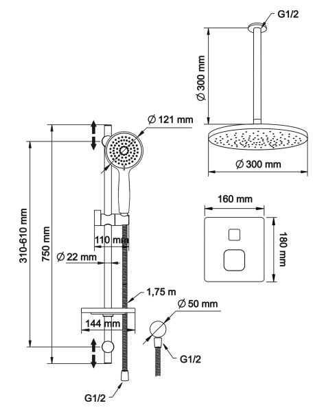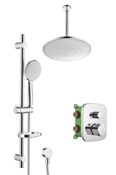 Душевой комплект со встраиваемым термостатическим смесителем на 2 выхода (в монтажном боксе), верхним душем ø300 мм и лейкой ø121 мм (3 режима)