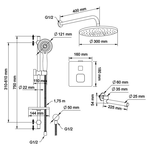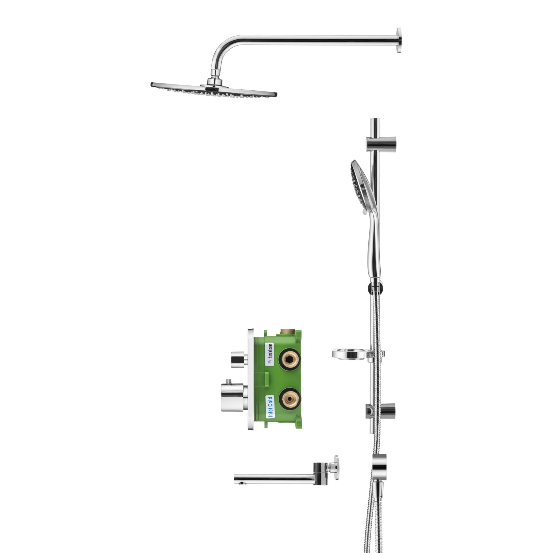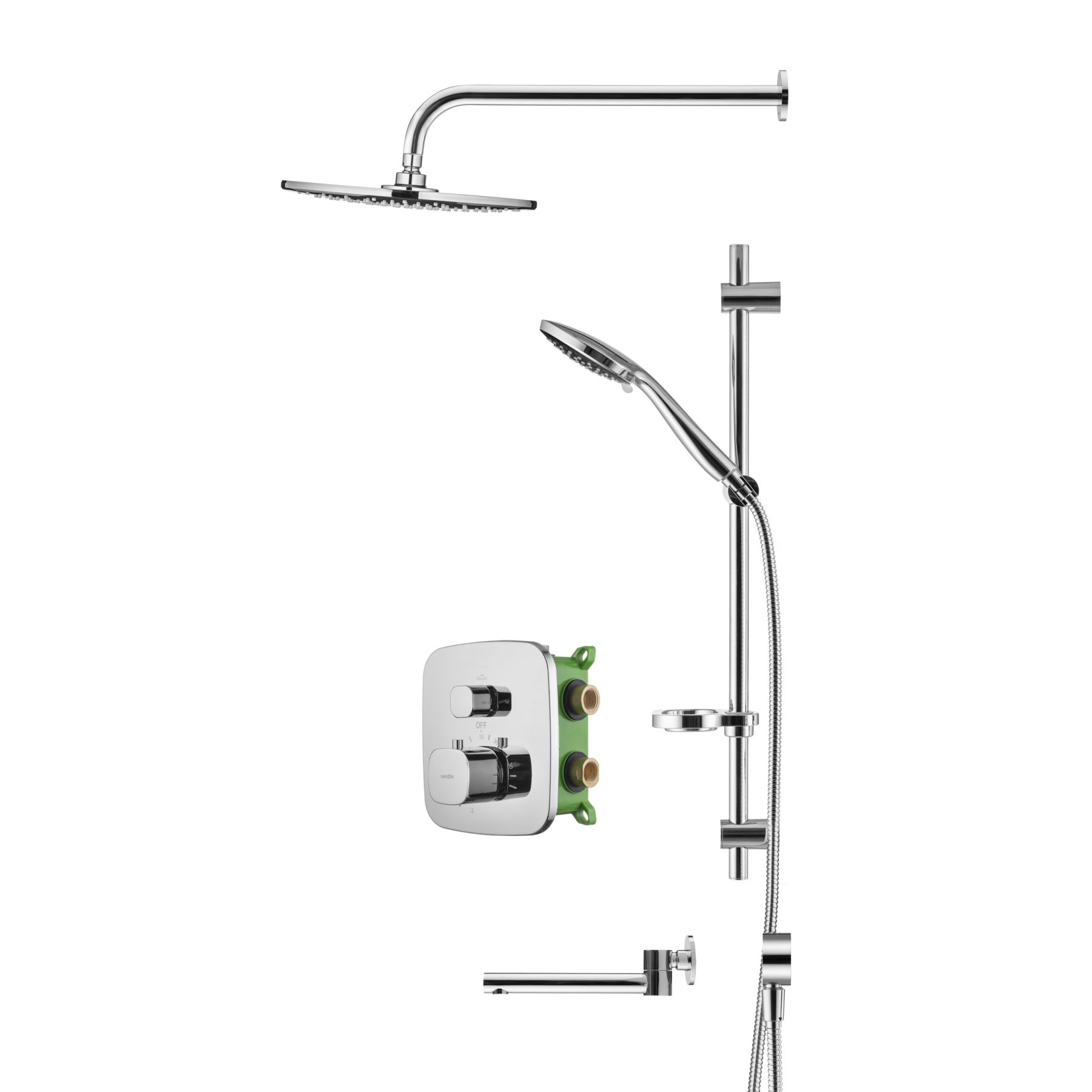 Душевой комплект со встраиваемым термостатическим смесителем на 3 выхода (в монтажном боксе), верхним душем ø300 мм, лейкой ø121 мм (3 режима) и поворотным изливом. Цвет: хром, серый