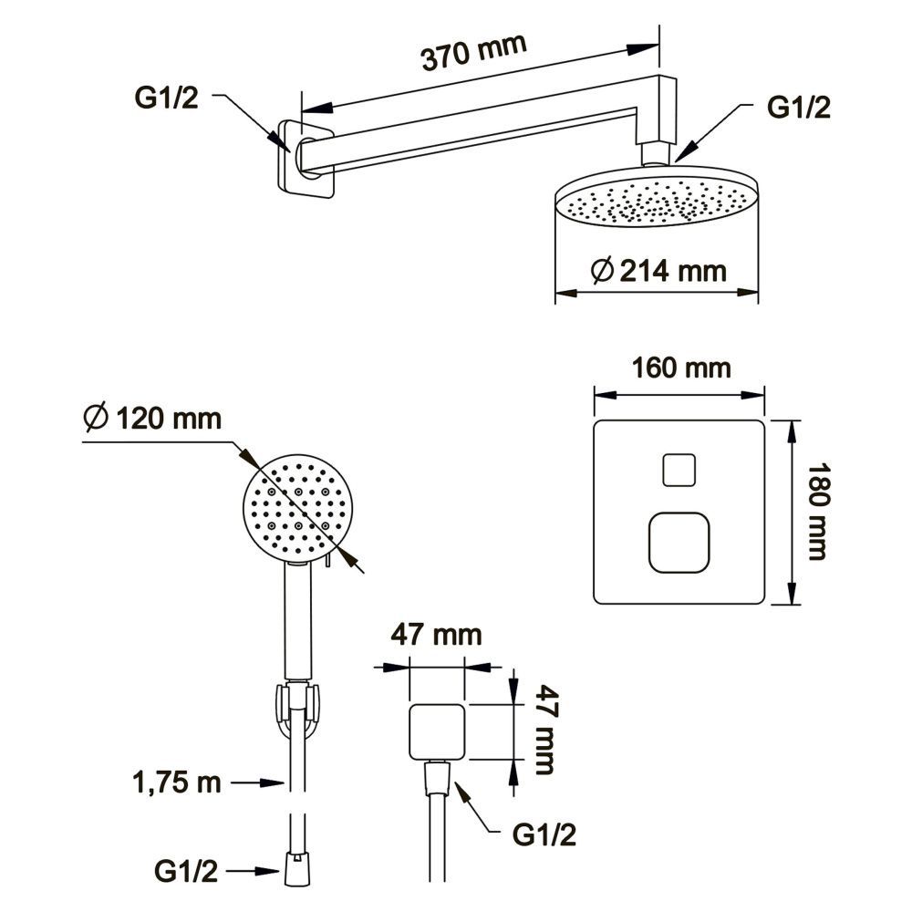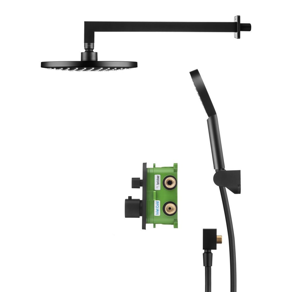 Душевой комплект со встраиваемым термостатическим смесителем на 2 выхода (в монтажном боксе), верхним душем ø214 мм и лейкой ø120 мм (3 режима) цвет: черный