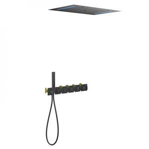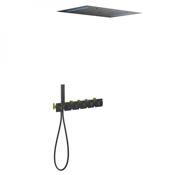 Черная сантехника становится все более популярной для ванных комнат из-за способности расставлять акценты.Встраиваемая душевая система с термостатом Timo Petruma 5229 относится к премиальному сегменту, предназначена для монтажа в полой или твердой стене. Термостатический картридж поддерживает стабильную температуру воды, обеспечивая максимально комфортные условия для принятия водных процедур. Встроенный потолочный душ большого размера создает имитацию проливного дождя, вода обливает человека целиком. Регулируя напор воды можно получить массажное воздействие, что очень полезно для здоровья. Основные преимущества встроенной системы: элегантный внешний вид, все коммуникации и крепления спрятаны в стену и потолок, снаружи видны только декоративные элементы. Установить встроенную систему можно в любом месте. Сложностей монтажа не возникает при установке элементов душевой системы опытным сантехником. Внимательно изучите инструкцию по монтажу и эксплуатации.Черная сантехника требует бережного ухода.