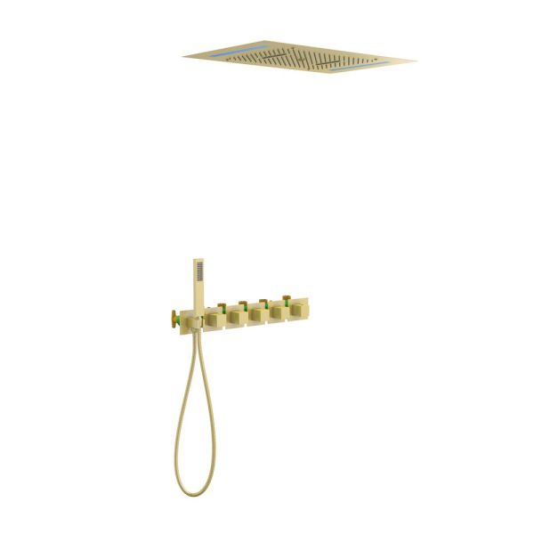 Цвет "матовое золото" никогда не выйдет из моды, во все времена драгоценный металл был признаком богатства.Встраиваемая душевая система с термостатом Timo Petruma 5229 относится к премиальному сегменту, предназначена для монтажа в полой или твердой стене. Термостатический картридж поддерживает стабильную температуру воды, обеспечивая максимально комфортные условия для принятия водных процедур. Встроенный потолочный душ большого размера создает имитацию проливного дождя, вода обливает человека целиком. Регулируя напор воды можно получить массажное воздействие, что очень полезно для здоровья. Основные преимущества встроенной системы: элегантный внешний вид, все коммуникации и крепления спрятаны в стену и потолок, снаружи видны только декоративные элементы. Установить встроенную систему можно в любом месте. Сложностей монтажа не возникает при установке элементов душевой системы опытным сантехником. Внимательно изучите инструкцию по монтажу и эксплуатации.