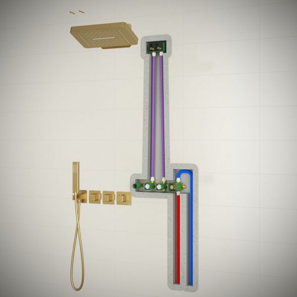 Цвет "матовое золото" никогда не выйдет из моды, во все времена драгоценный металл был признаком богатства.Душевая система с термостатом Timo Petruma 5249 относится к премиальному сегменту, предназначена для монтажа в полой или твердой стене. Термостатический картридж поддерживает стабильную температуру воды, обеспечивая максимально комфортные условия для принятия водных процедур. Настенный душ с двумя режимами позволяет принимать водные процедуры в зависимости от настроения. Регулируя напор воды можно получить массажное воздействие различной интенсивности. Используя режим "каскад"- получают седативное (успокаивающее) воздействие на затылочную часть головы или шейный отдел. Основные преимущества встроенной системы: элегантный внешний вид, все коммуникации и крепления спрятаны в стену, снаружи видны только декоративные элементы. Установить встроенную систему можно в любом месте. Использовать такой смеситель очень удобно, регулировка температуры воды осуществляется ручкой термостата (расположена справа). Переключение режимов "каскад", "тропический душ", "ручной душ" и увеличение напора осуществляется поворотом ручек диверторов расположенных слева от термостата. В положении ручек диверторов в положение 12:00 (смеситель выключен). Смеситель может работать в нескольких режимах одновременно"каскад"+"ручной душ", "тропический душ"+"ручной душ". Сложностей монтажа не возникает при установке элементов душевой системы опытным сантехником. Внимательно изучите инструкцию по монтажу и эксплуатации.