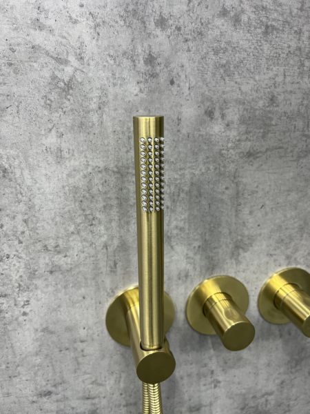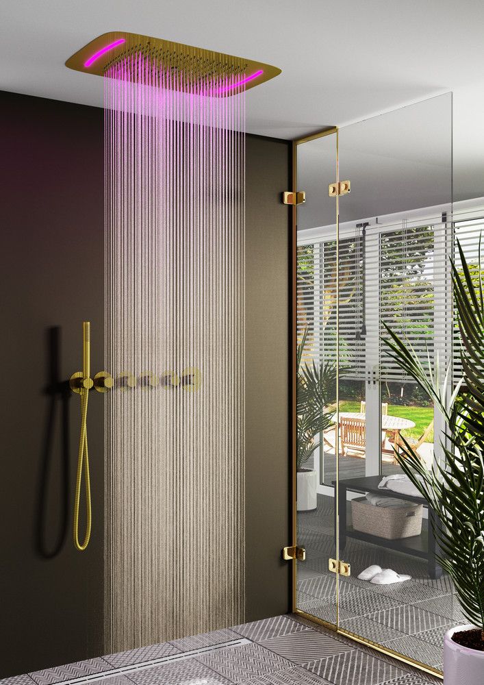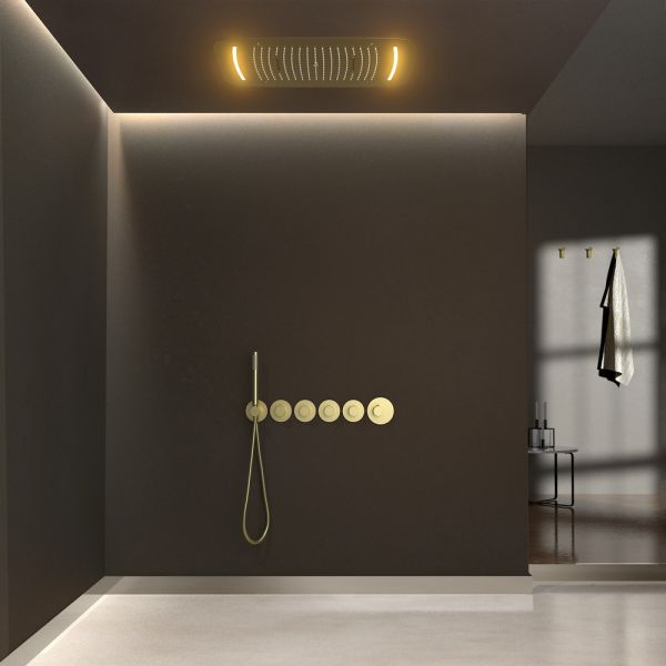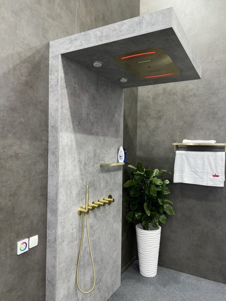 Цвет "матовое золото" никогда не выйдет из моды, во все времена драгоценныый металл был признаком богатства.Душевая система с термостатом Timo Saona 2319 относится к премиальному сегменту, предназначена для монтажа в полой или твердой стене. Термостатический картридж поддерживает стабильную температуру воды, обеспечивая максимально комфортные условия для принятия водных процедур. Встроенный потолочный душ большого размера создает имитацию проливного дождя, вода обливает человека целиком. Регулируя напор воды можно получить массажное воздействие, что очень полезно для здоровья. Основные преимущества встроенной системы: элегантный внешний вид, все коммуникации и крепления спрятаны в стену и потолок, снаружи видны только декоративные элементы. Установить встроенную систему можно в любом месте. Использовать такой смеситель очень удобно, регулировка температуры воды осуществляется ручкой термостата (расположена снизу). Режим "тропический душ" и увеличение напора осуществляется поворотом ручки дивертора (расположена сверху) влево. Для переключения в режим "ручной душ" верните ручку дивертора в исходное положение 12:00 (смеситель выключен), а затем поверните вправо. Увеличение напора воды осуществляется поворотом ручки вправо. Сложностей монтажа не возникает при установке элементов душевой системы опытным сантехником.