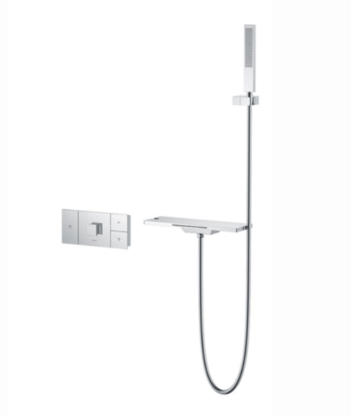 Комплектация: полка с изливом и держателем ручного душа, ручной душ, смеситель со встраиваемой частью.