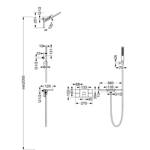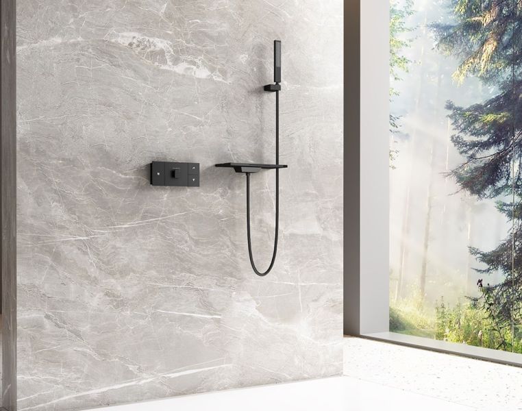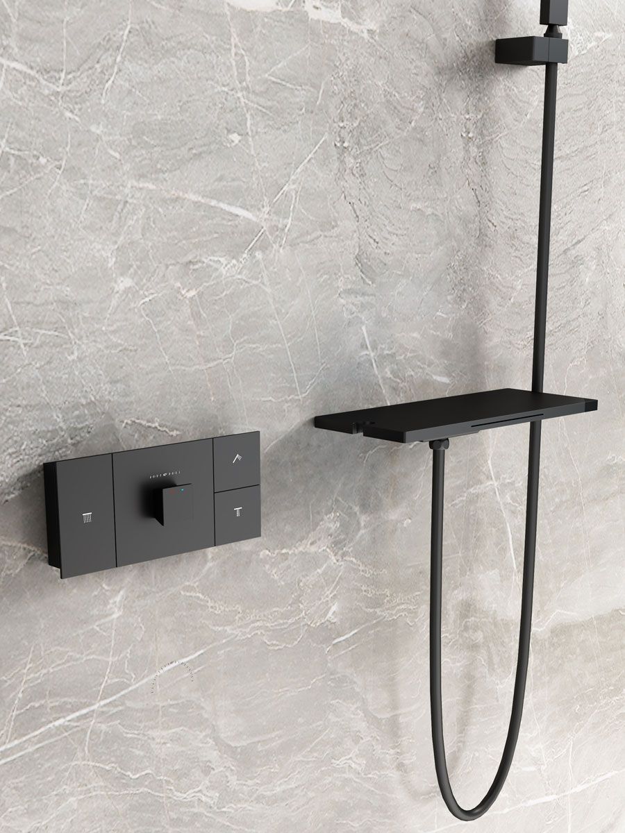 Комплектация: полка с изливом и держателем ручного душа, ручной душ, смеситель со встраиваемой частью.