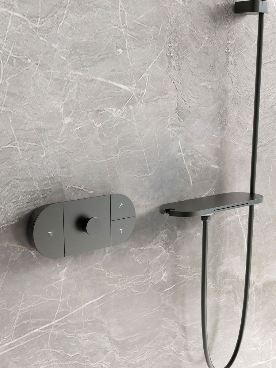 - Комплектация: верхний душ, полка с каскадным изливом и держателем ручного душа, ручной душ, смеситель со встраиваемой частью