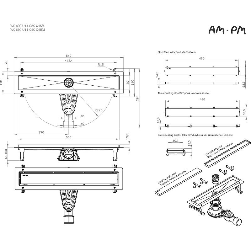 Душевой лоток AM.PM MasterFlow 50 W01SC-U11-050-04SB.Детально проработанная форма изделия, точные выверенные линии. Представляем инновационный лоток для душа Masterflow.Универсальная двухсторонняя решетка лотка может быть использована как самостоятельная декоративная вставка, либо как база для вклейки плитки.Лоток для душа имеет высокую пропускную способность 50 л/мин. Обладает комбинированным затвором: сухим магнитным и гидрозатвором. Проверенная технология гарантирует 100% защиту от проникновения запахов из канализации, высокую надежность и долговечность. Выдерживает даже самые большие механические нагрузки. Поворотный сифон на 360 градусов позволяет установить лоток наиболее удобным и комфортным образом.Продукт обладает низкой высотой монтажа и возможностью регулировки, что предполагает экономию бюджета при заливке пола. Нержавеющая сталь со специальным антикоррозийным защитным покрытием, нанесенная методом кислотной пассивации. Выход разработан на два диаметра: 40 и 50 мм, которые выбираются в процессе монтажа.Характеристики:Цвет решетки: хром матовый.