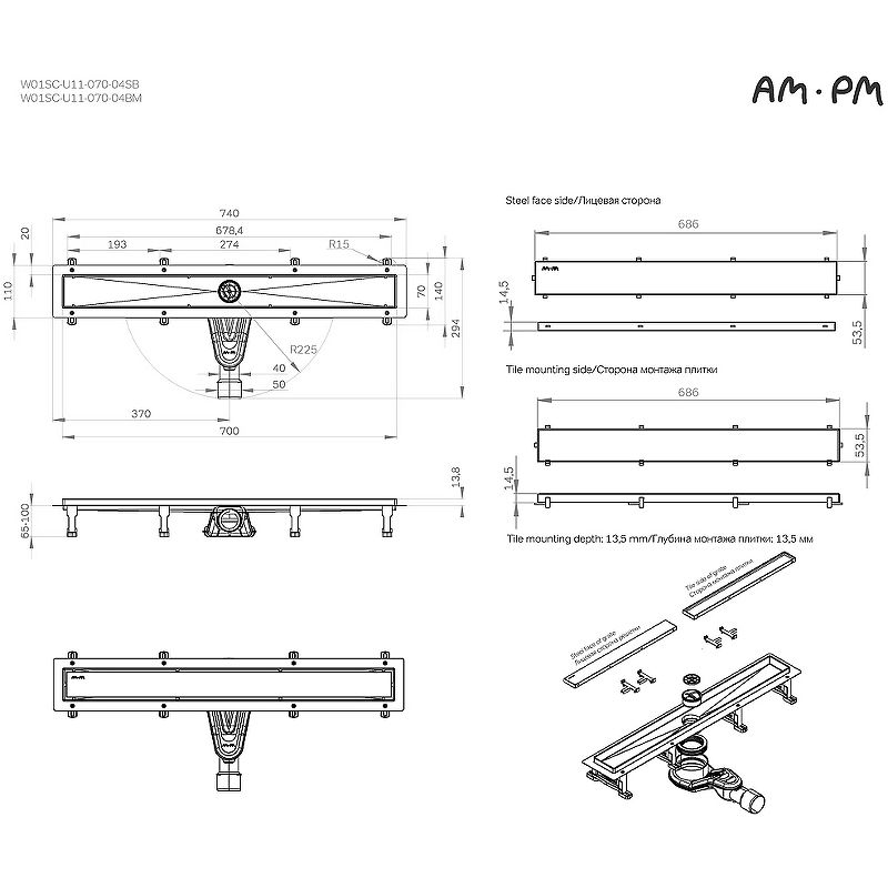Душевой лоток AM.PM MasterFlow 70 W01SC-U11-070-04SB.Детально проработанная форма изделия, точные выверенные линии. Представляем инновационный лоток для душа Masterflow.Универсальная двухсторонняя решетка лотка может быть использована как самостоятельная декоративная вставка, либо как база для вклейки плитки.Лоток для душа имеет высокую пропускную способность 50 л/мин. Обладает комбинированным затвором: сухим магнитным и гидрозатвором. Проверенная технология гарантирует 100% защиту от проникновения запахов из канализации, высокую надежность и долговечность. Выдерживает даже самые большие механические нагрузки. Поворотный сифон на 360 градусов позволяет установить лоток наиболее удобным и комфортным образом.Продукт обладает низкой высотой монтажа и возможностью регулировки, что предполагает экономию бюджета при заливке пола. Нержавеющая сталь со специальным антикоррозийным защитным покрытием, нанесенная методом кислотной пассивации. Выход разработан на два диаметра: 40 и 50 мм, которые выбираются в процессе монтажа.Характеристики:Цвет решетки: хром матовый.