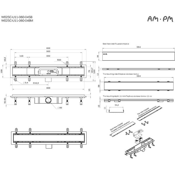 Душевой лоток AM.PM PrimeFlow 60 W02SC-U11-060-04SB с решеткой Хром матовый / под плитку Tile купить