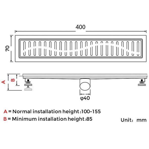 Душевой трап линейный Gappo G84007-3, длина 40 см, цвет сатин, изготовлен трап из нержавеющей стали. Минимальная монтажная высота 85 мм, боковой выпуск 40 мм, в комплекте переходник на 50 мм. Защита от запаха: комбинированный гидрозатвор, защита от проникновения запаха и жидкости из канализации.