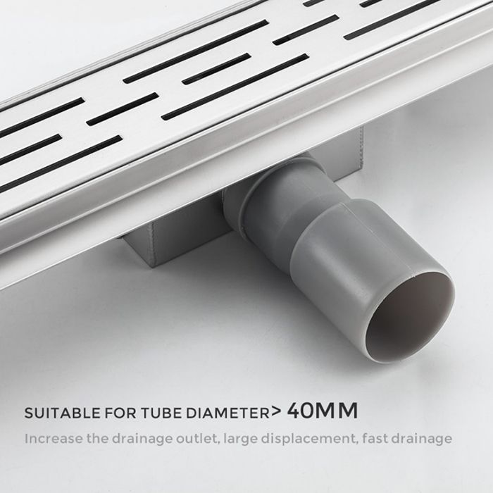 Линейный трап с большой просечкой Gappo G85007-1, цвет сатин, длина 50 см, изготовлен трап из нержавеющей стали. Минимальная монтажная высота 85 мм, боковой выпуск 40 мм, в комплекте переходник на 50 мм. Защита от запаха: комбинированный гидрозатвор, защита от проникновения запаха и жидкости из канализации.