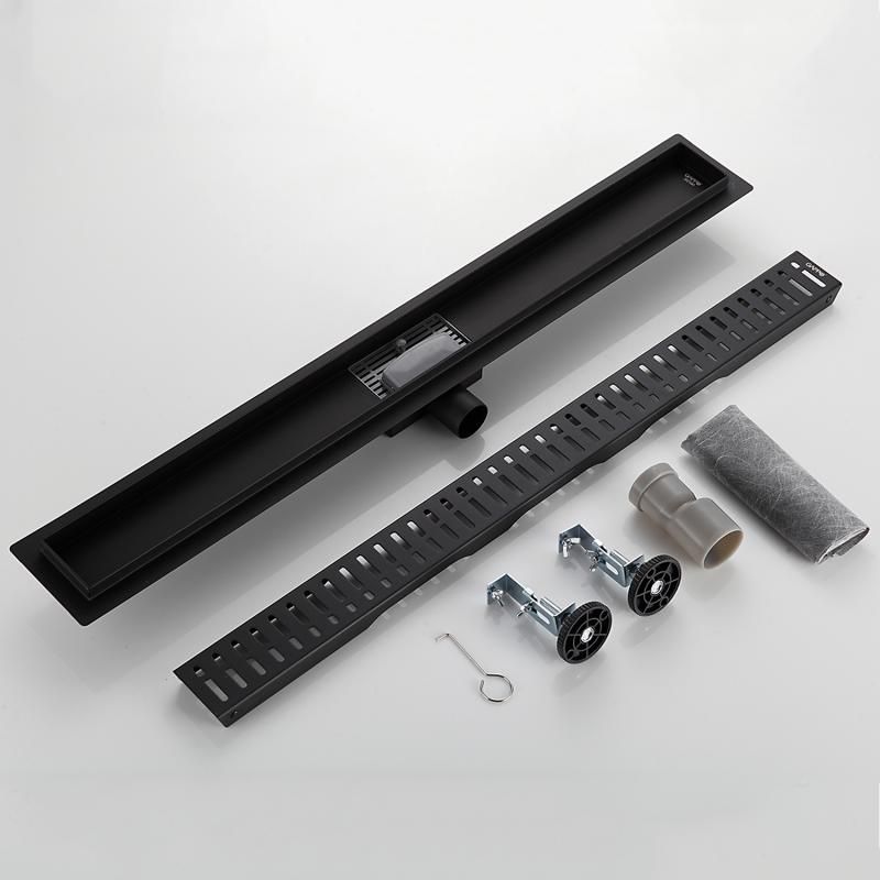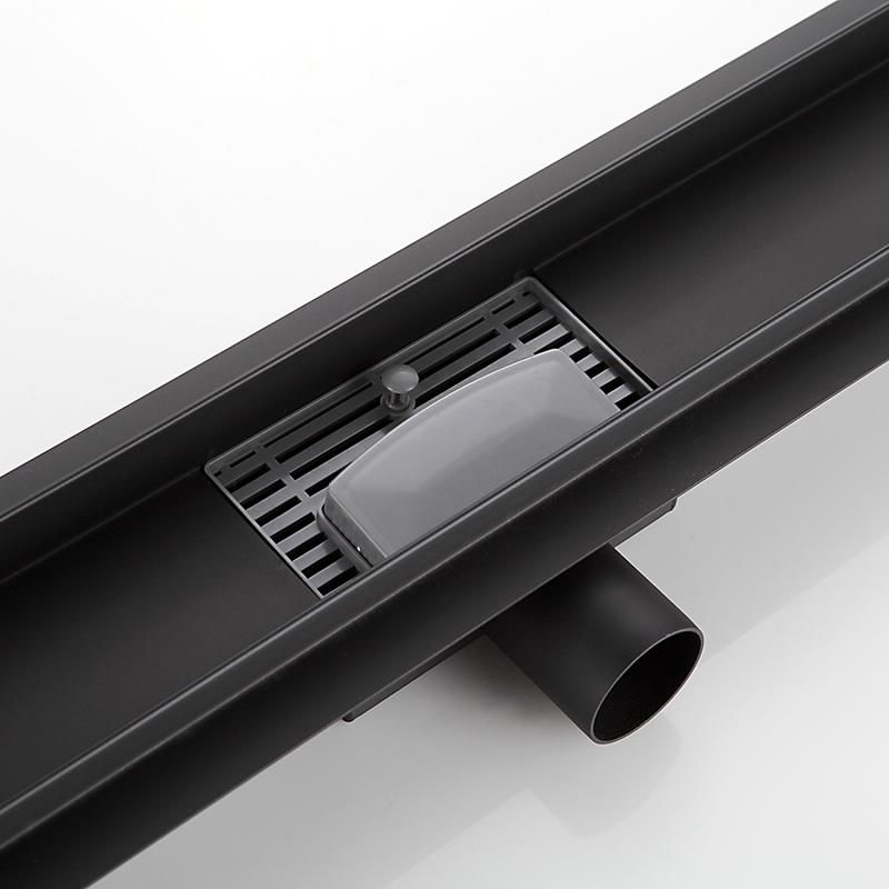Черный линейный трап 80 см Gappo G88007-36 изготовлен из нержавеющей стали, минимальная монтажная высота 85 мм, боковой выпуск 40 мм, в комплекте переходник на 50 мм. Защита от запаха: комбинированный гидрозатвор, защита от проникновения запаха и жидкости из канализации.
