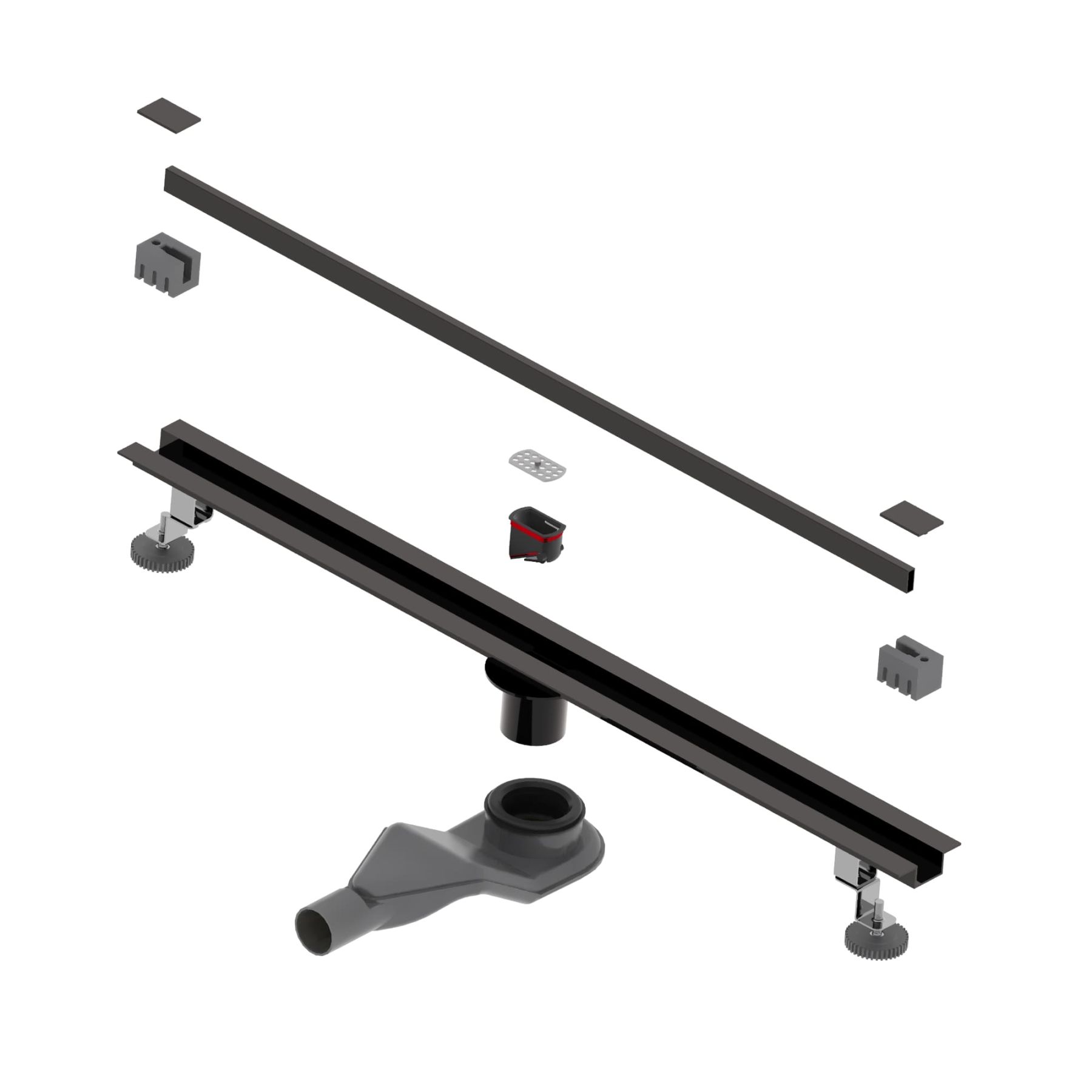 Принимающей декоративный жёлоб маскирует сливное устройство, образует щель, куда сливается вся вода из душевого пространства. Для того чтобы вода эффективно отводилась в трап, на этапе монтажа необходимо обеспечить уклон облицовочной плитки в сторону принимающего жёлоба.Для доступа к технической части устройства с целью очистки необходимо извлечь среднюю часть жёлоба вместе с боковыми декоративными заглушками.Лоток выполнен из нержавеющей стали толщиной 2 мм, собирает стекающую воду и за счёт технического уклона отводит её в сетку-фильтр, которая задерживает волосы и мелкий мусор.Далее вода проходит в сифон с комбинированным затвором, Первая вода сталкивается с сухим затвором, который изготовлен из высокопрочного ABS-пластика. Затвор выполнен в виде крышки с силиконовой прокладкой, крышка открывается под давлением воды и плотно притягивается при отсутствии воды за счёт пружинного механизма, обеспечивая 100% защиту от проникновения неприятных запахов в ванную комнату из канализации.После вода проходит через сифон с гидрозатвором и сливается в канализацию.Сифон с гидрозатвором присоединяется к нижней части лотка трапа и имеет боковой отвод с поворотом на 360 градусов, что позволяет подключить канализационный сток с любой стороны.