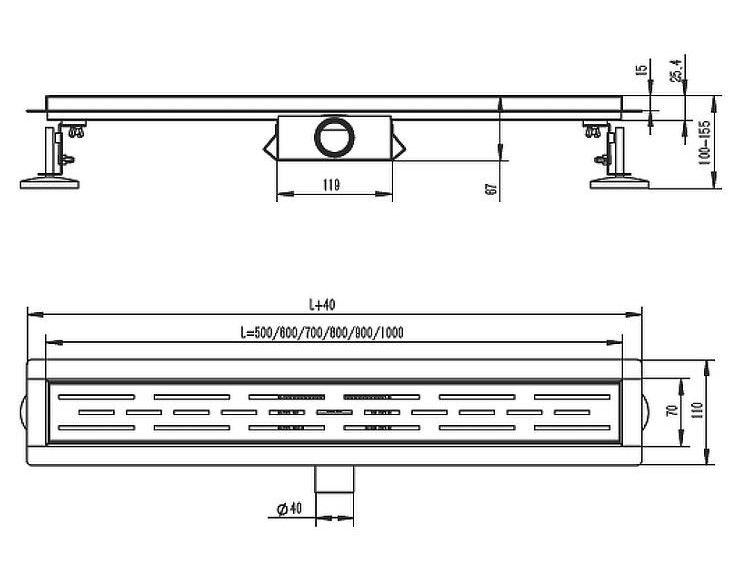 Трап изготовлен из высококачественной нержавеющей стали, в коллекции цвета трапа представлены в нескольких вариантах - черный матовый, сатиновый, золотой, графит. Линейный трап под кладку плитки для душа предназначен для отвода воды с пола или поддона под душем. Широкий диапазон регулировки по высоте позволяет устанавливать трап в новых ванных комнатах. Индивидуально регулируемые ножки обеспечивают беспроблемную установку, даже в тех случаях, когда Вы сталкиваетесь со значительными неровностями в различных частях монтажной поверхности. Трап обеспечивает свободный слив воды в канализационную систему, также собирая мусор, не давая ему засорять сливные каналы. Принцип работы сухого затвора: легкий поплавок диаметром больше сливного отверстия опускается и закрывает трубу в случае высыхания воды. В рабочем положении вода поднимает и удерживает поплавок на одном уровне и система работает, как один из вариантов гидрозатвора. Если трап не используется, то вода из затвора испаряется, а поплавок закрывает сливное отверстие. Диаметр сливной трубы: 40 мм. Максимальная высота монтажа: 155 мм. Минимальная высота монтажа: 100 мм. Выпуск: горизонтальный. Материал корпуса: нержавеющая сталь. Защита от запаха: сухой+гидрозатвор