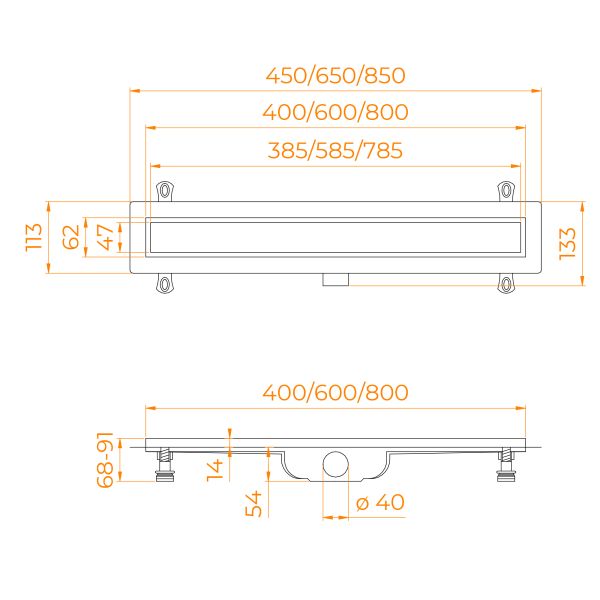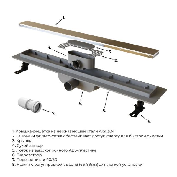Душевой трап Leo-11 – это сантехническое изделие, созданное для отведения воды из зоны, душевого пространства, выложенное керамической плиткой или мозаикой. Модельный ряд представлен в трех вариантах длины: 40, 60 и 80 см. Трап укомплектован комбинированным затвором гидро+сухой затвор, такая конструкция позволяет на 100% исключить проникновение неприятного запаха в ванную комнату. Решётка выполнена из нержавеющей стали AISI 304, а лоток выполнен из высокопрочного ABS-пластика, такая конструкция обеспечивает максимальную надёжность конструкции более 10 лет. Решётка двухсторонняя-перевернув решётку в неё можно вложить плитку, что позволит получить идеальное сочетание с основным покрытием пола, в комплекте гидроизоляционная лента. Для эффективного стока воды лоток трапа имеет технический уклон, а для улавливания крупного мусора и волос в конструкцию входит съёмный фильтр-сетка, с помощью которого трап с лёгкостью очищается. В комплектации присутствуют ножки с регулировкой высоты, что позволит с лёгкостью произвести монтаж трапа в пол. Пропускная способность 42 л/мин.