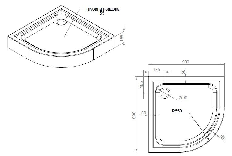 Размер 900x900x160 мм, R - 550 мм, материал акрил. Сифон и ножки в комплекте.