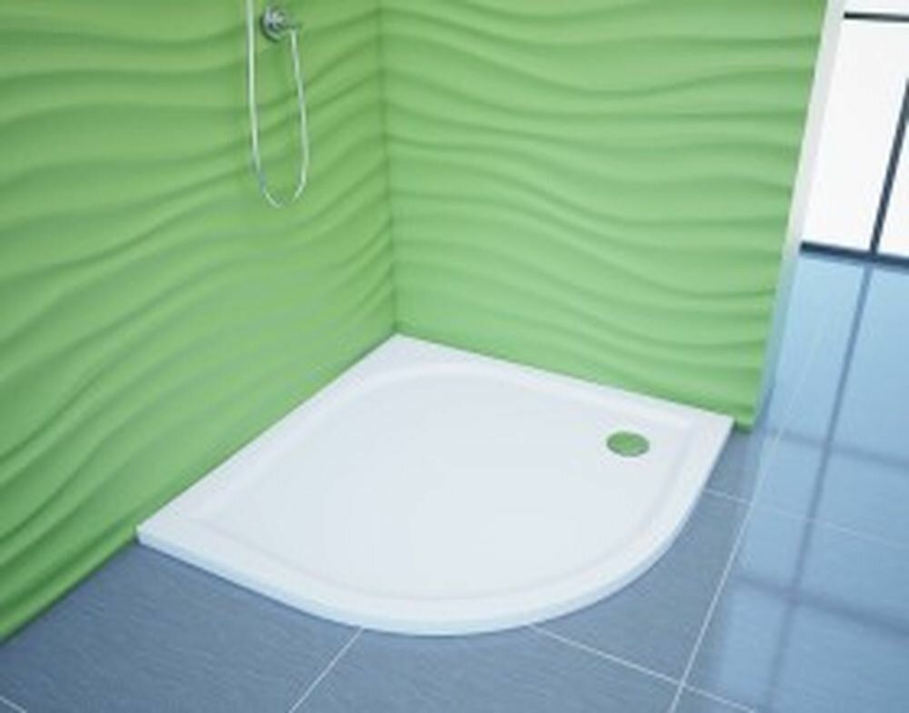 Для малогабаритных санузлов мы разработали угловые душевые поддоны. Поддон Омега имеет форму четверти круга. Бортики с внутренней стороны напоминают форму листочка.