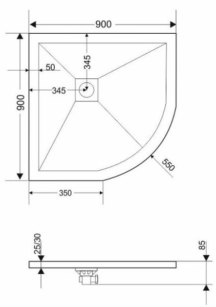 - Размеры поддона: четверть круга 90 x 90 толщина 2,5 см