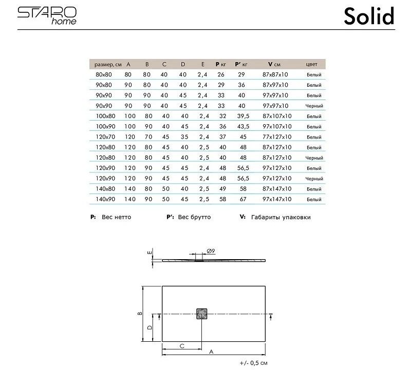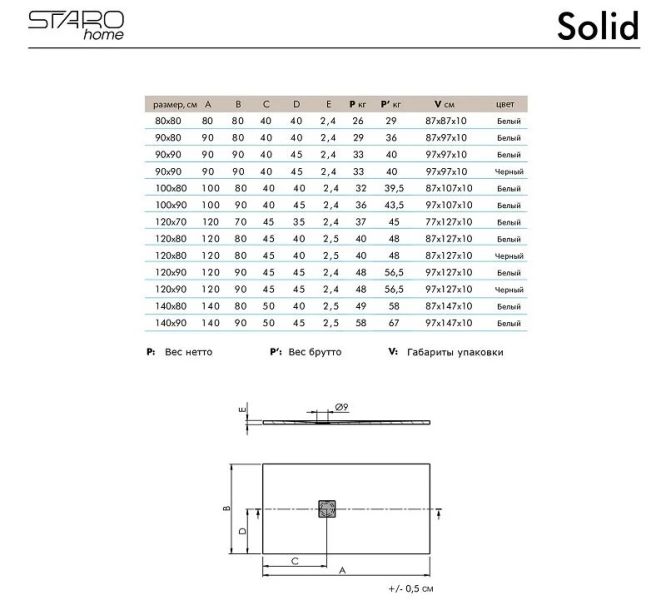 Душевой поддон Starohome Solid 120х90 WHITE MATT, 120 x 90 см, литьевой мрамор, прямоугольный, цвет белый матовыйДушевой поддон Solid изготовлен из литиевого мрамора Sanydur® и представляет собой монолитный материал на 85% состоящий из мраморной крошки, минеральных пигментов и связывающего материала в виде полиэфирной смолы. Сверху материал покрывается гелевым слоем Gel Coat Покрытие Gel Coat - это прочный прозрачный, абсолютно непористый материал, защищающий материал поддона от загрязнений, перепада температур и УФ-излучения. Душевые поддоны Solid производятся на современном европейском оборудовании для европейского рынка. Контроль качества осуществляется на всех этапах производства