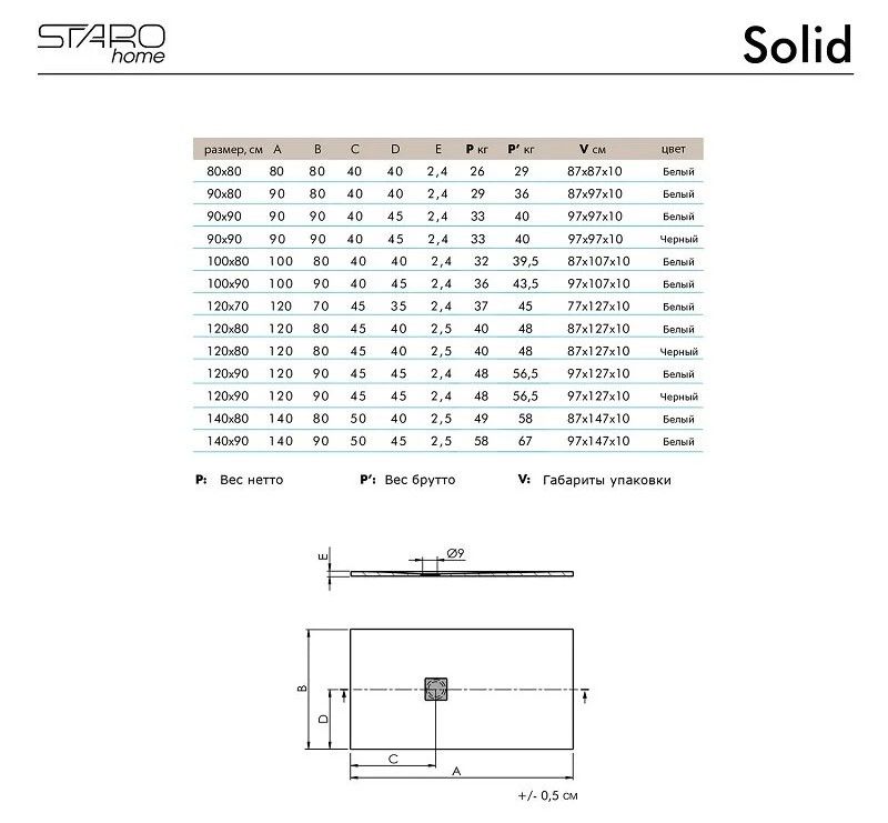 Душевой поддон Starohome Solid 90х80 WHITE MATT, 90 x 80 см, литьевой мрамор, прямоугольный, цвет белый матовыйДушевой поддон Solid изготовлен из литиевого мрамора Sanydur® и представляет собой монолитный материал на 85% состоящий из мраморной крошки, минеральных пигментов и связывающего материала в виде полиэфирной смолы. Сверху материал покрывается гелевым слоем Gel Coat Покрытие Gel Coat - это прочный прозрачный, абсолютно непористый материал, защищающий материал поддона от загрязнений, перепада температур и УФ-излучения. Душевые поддоны Solid производятся на современном европейском оборудовании для европейского рынка. Контроль качества осуществляется на всех этапах производства.