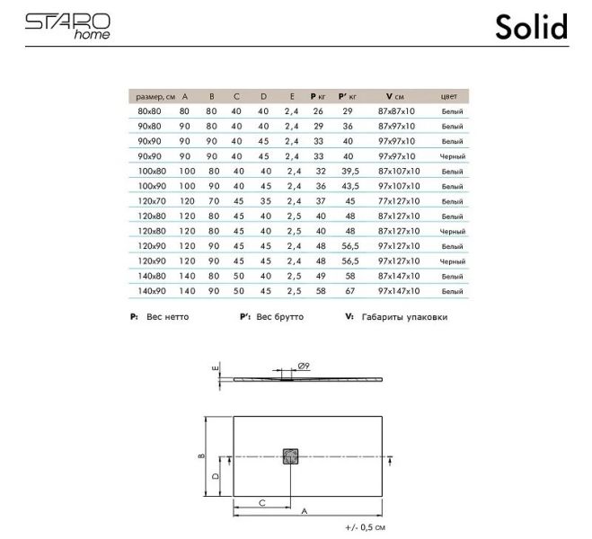 Душевой поддон Starohome Solid 120х80, литьевой мрамор, прямоугольный, цвет серый матовыйДушевой поддон Solid изготовлен из литиевого мрамора Sanydur® и представляет собой монолитный материал на 85% состоящий из мраморной крошки, минеральных пигментов и связывающего материала в виде полиэфирной смолы. Сверху материал покрывается гелевым слоем Gel Coat. Покрытие Gel Coat - это прочный прозрачный, абсолютно непористый материал, защищающий материал поддона от загрязнений, перепада температур и УФ-излучения. Душевые поддоны Solid производятся на современном европейском оборудовании для европейского рынка. Контроль качества осуществляется на всех этапах производства.