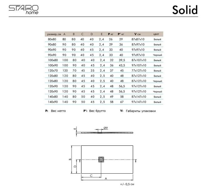Душевой поддон Starohome Solid 140х90, литьевой мрамор, прямоугольный, цвет чёрный матовыйДушевой поддон Solid изготовлен из литиевого мрамора Sanydur® и представляет собой монолитный материал на 85% состоящий из мраморной крошки, минеральных пигментов и связывающего материала в виде полиэфирной смолы. Сверху материал покрывается гелевым слоем Gel Coat Покрытие Gel Coat - это прочный прозрачный, абсолютно непористый материал, защищающий материал поддона от загрязнений, перепада температур и УФ-излучения. Душевые поддоны Solid производятся на современном европейском оборудовании для европейского рынка. Контроль качества осуществляется на всех этапах производства.