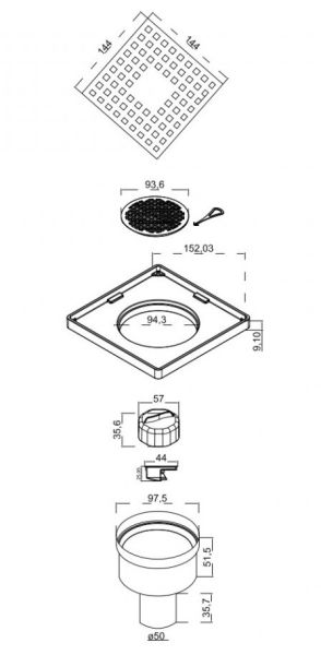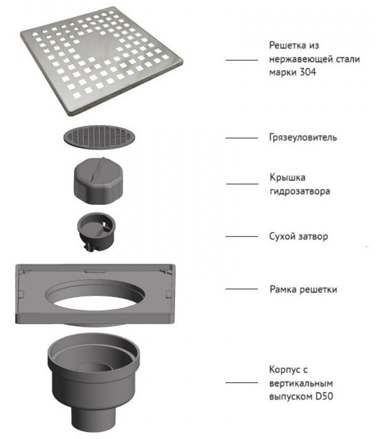 Решетка толщина 0,8 ммНержавеющая сталь AISI 304Горловина трапа пластикКомбинированный затворКорпус PP Вертикальный выпуск D50Монтаж 360°