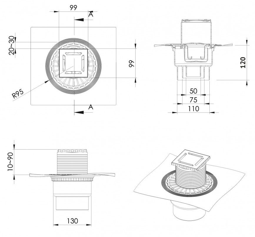 Решетка толщина 3мм, нержавеющая сталь AISI 304Горловина трапа и эксцентрик, пластикМонтажная заглушка, PPСифон PP с гидроизоляцией: вертикальный выпуск D50/75/110, монтаж 360°Комбинированный затворФланец с 3 сторон загибается на 90°Монтажный ключ, пластик