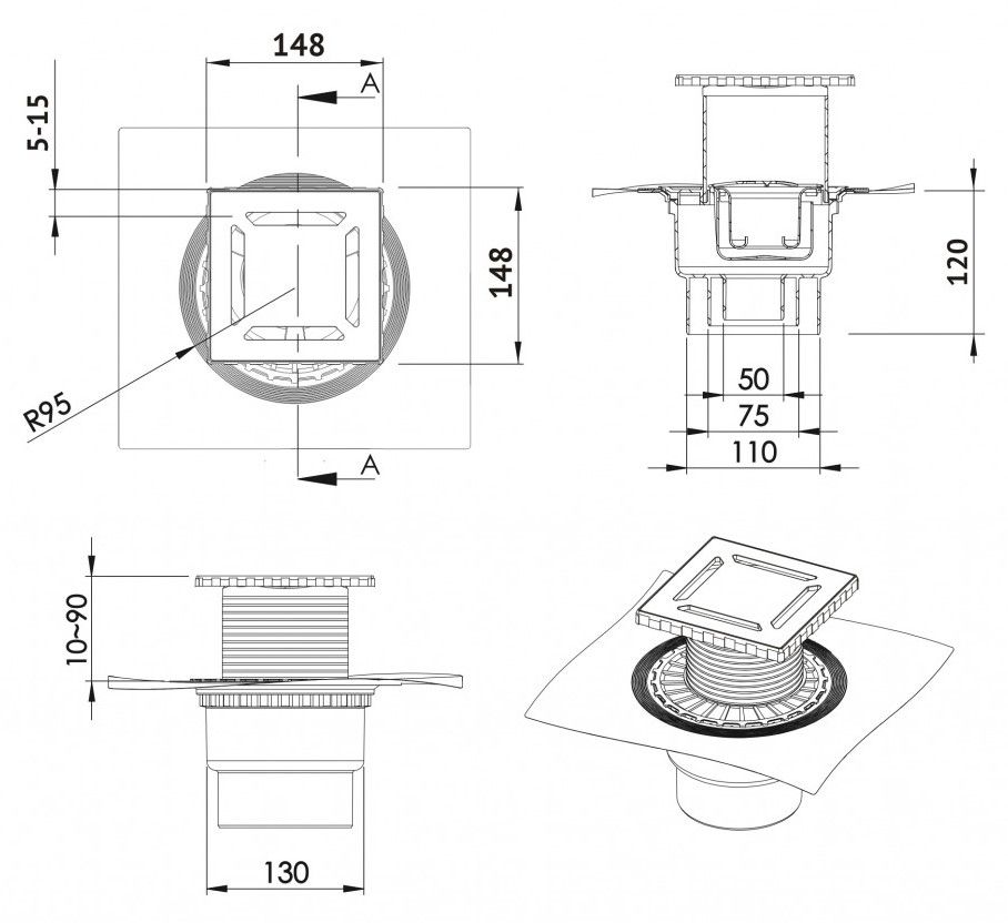 Решетка для плитки, нержавеющая сталь AISI 304Горловина трапа и эксцентрик, пластикМонтажная заглушка, PPКорпус PP с гидроизоляцией: вертикальный выпуск D50/75/110, монтаж 360°Комбинированный затворФланец с 3 сторон загибается на 90°Монтажный ключ, пластик