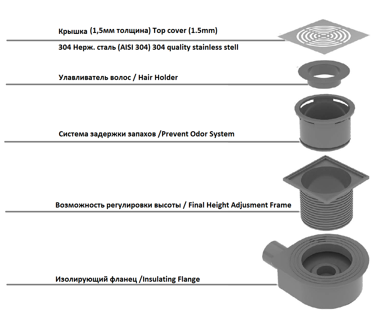 Оснащение: решетка / улавливатель волос / изолирующий фланец.