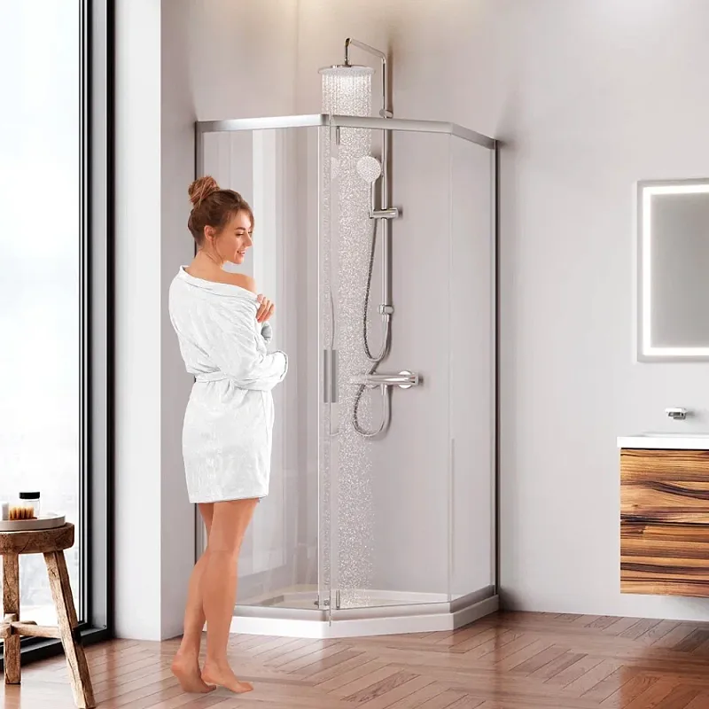 Душевой уголок AM.PM Gem W90G-405-090MT профиль серебристый 90х90 смДушевое ограждение от бренда AM.PM из коллекции Gem - легкая функциональная конструкция для стильного оформления душевой зоны в ванной комнате. Каждая деталь соответствует высоким требованиям к качеству и эргономике. Цвет профиля - серебристый. Размер (Ш/Г/В): 900x900x1900 мм. Материал ограждения - прозрачное стекло; алюминий. Толщина стекла - 5 мм. Форма - пятиугольная.