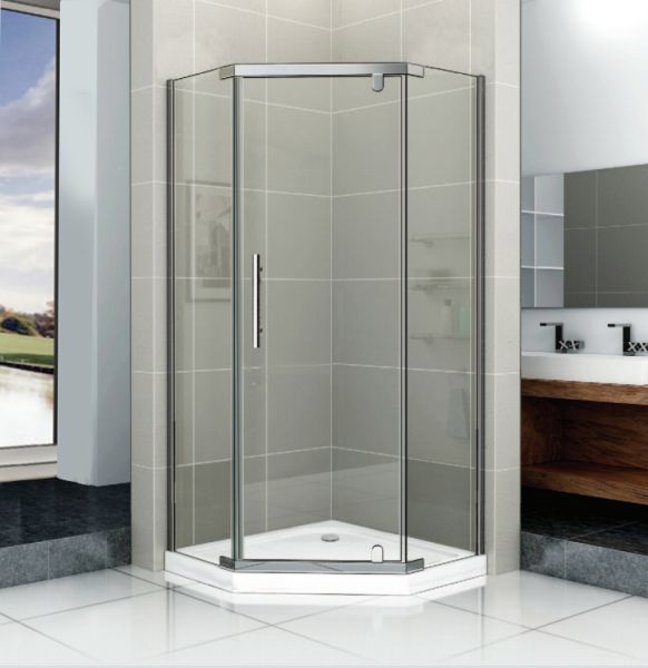 МОНТАЖ БЕЗ СИЛИКОНАУголок ZPE911T душевой PARLY с поддоном (90х90х195)Размер: 90х90х195 смСтильный уголок пятиугольной формы с распашной дверью. Прозрачное стекло и полированный профиль придают модели визуальную легкость. Уголок не утяжеляет пространство и хорошо дополняет любое оформление ванной комнаты.