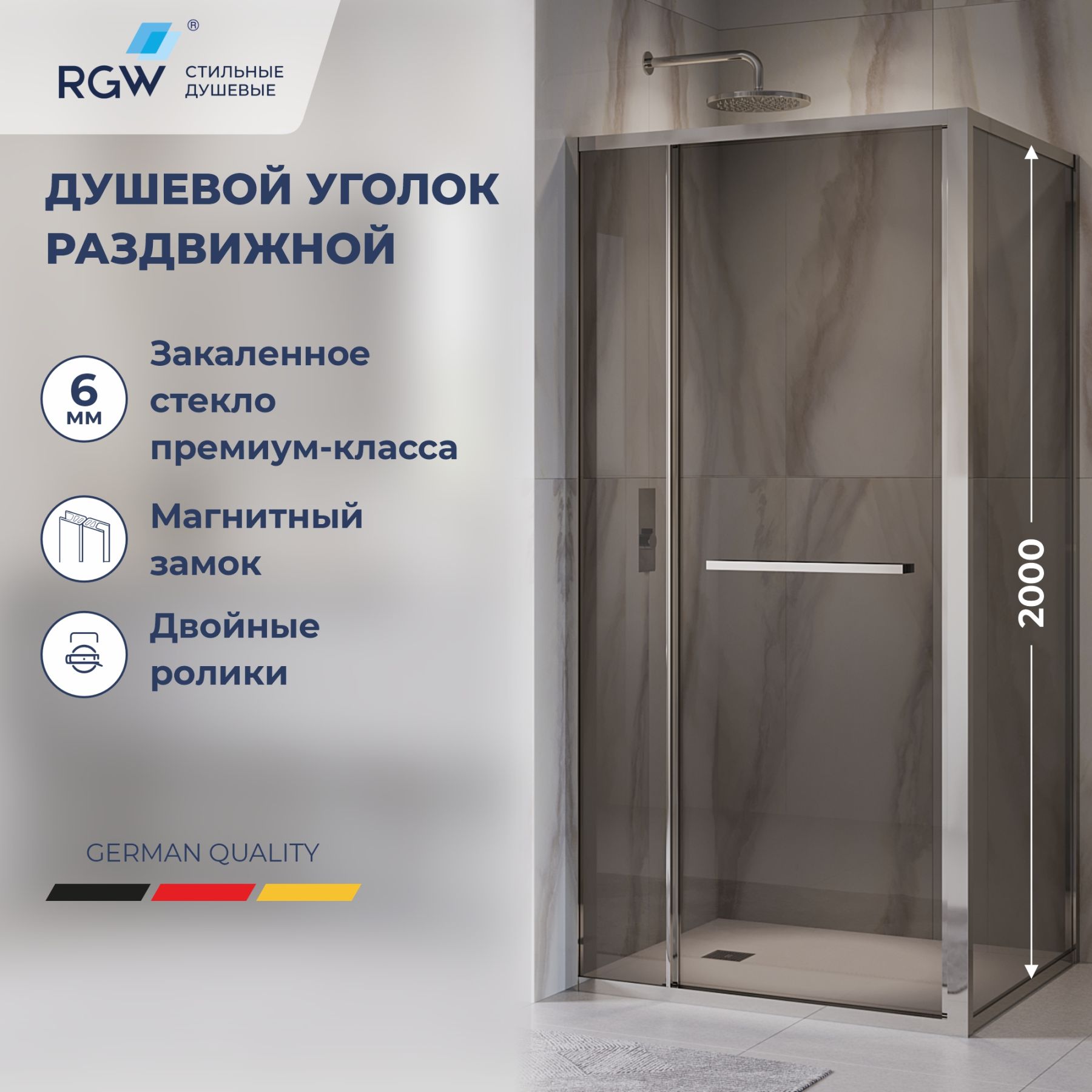 Прямоугольный угол образуют три стекла - два стационарных полотна и одно полотно «Дверь», которое при нажатии на дверную ручку плавно толкает дверное полотно вовнутрь душевой зоны к боковому стационарному стеклу. Магнитный замок, вмонтированный в профиль двери, качественно герметизирует вход.Душевое ограждение имеет универсальную установку открытия двери – с левой или правой стороны.