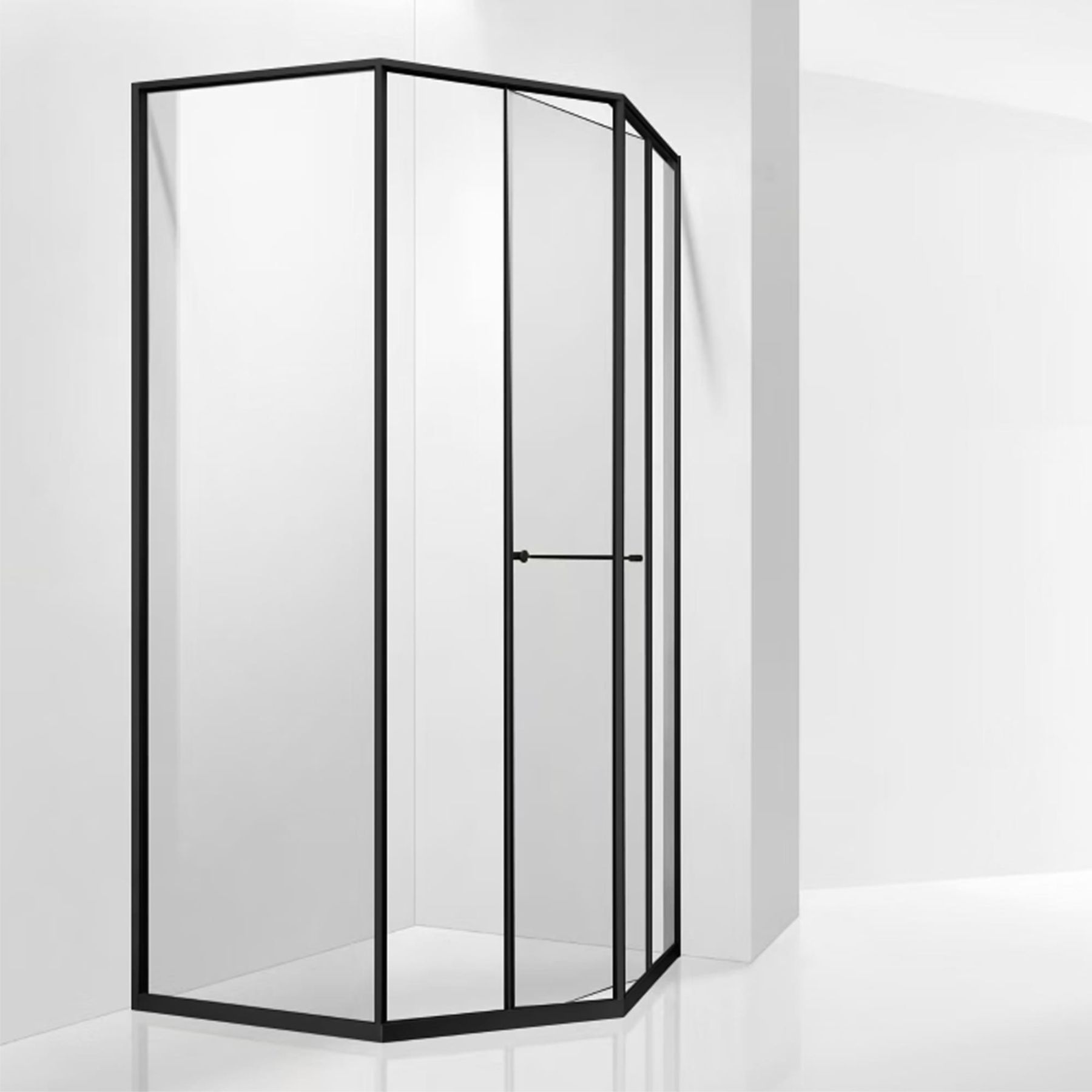 Инновационный механизм раздвижной системы при открытии плавно смещает дверь вдоль стационарного стекла при этом обеспечивая комфортный вход и просторное пространство внутри душевого угла.
