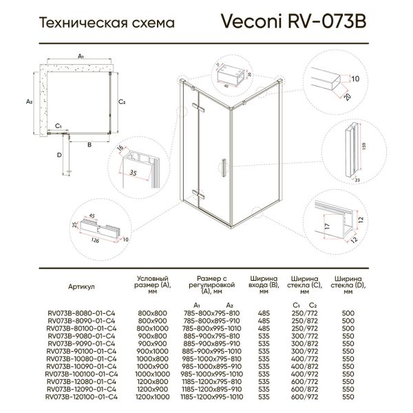 Душевой уголок Veconi Rovigo RV-073B, 800х1000х1950, черный, прозрачное стекло купить