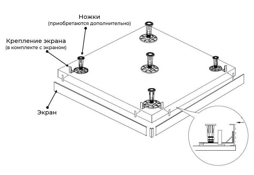 Комплектация: 2 экрана (фронтальный и боковой), соединительный уголок, крепление к ножкам на которые устанавливается поддон.