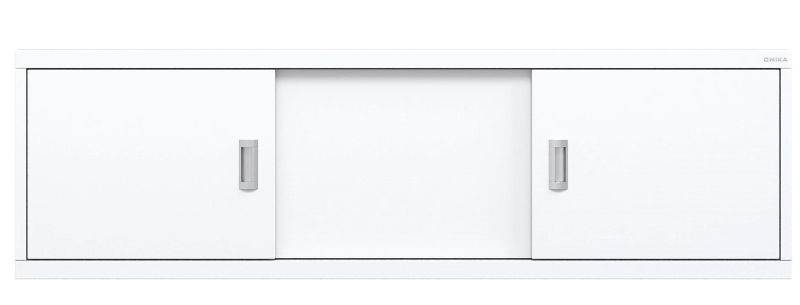 Конструкция имеет три подвижные раздвижные двери из МДФ, покрытых высокоглянцевой белой пленкой. Две боковые дверцы с врезными хромированными металлическими ручками.
