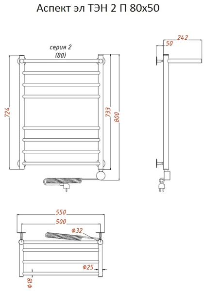 Внимание! Для скрытого монтажа электропроводки необходимо приобрести комплект скрытого подключения.Полотенцесушитель электрический комплектуется ТЭНом с терморегулятором и таймером.Изделие производится из нержавеющей стали AISI 201. Вертикальные трубы d -32 мм., для горизонтальных вставок используется труба d — 18 мм.Нагревательным элементом в полотенцесушителе является ТЭН. Полотенцесушитель заполнен бытовым антифризомЭкономичность: ТЭН нагревает антифриз до нужной температуры и выключается, далее при остывании полотенцесушителя он включается опять. Таким образом он работает не постоянно и получается, что ТЭН потребляет электричество не 300 Вт, а порядка 100 — 150 ВтМощность электрического прибора порядка 100 Вт при стоимости 1 Вт — 5 руб несложно посчитать: 100Вт х 24 = 2,4 кВт в сутки. Стоимость эксплуатации изделия за сутки 2,4 кВт х 5 руб. = 12 руб. При максимальной температуре расход электричества за 30 дней составит порядка 360 руб. При условии если сушка работает круглосуточно на максимальной температуре.Удобство монтажа: Полотенцесушитель крепится к стене на четыре держателя. Изначально ТЭН не установлен в полотенцесушитель для безопасной транспортировки, его можно установить, как справа, так и слева предварительно перевернув полотенцесушитель вверх ногами и выкрутив заглушку с нужной стороны на место в которое установится ТЭН.Примечание. Внимательно изучите инструкцию по установке ТЭНа!Скрытое подключение: Для скрытого монтажа электропроводки необходимо приобрести комплект скрытого подключения.Подключение в розетку: В комплекте с ТЭНом имеется шнур с вилкой, который будет необходим при подключении к розетке.